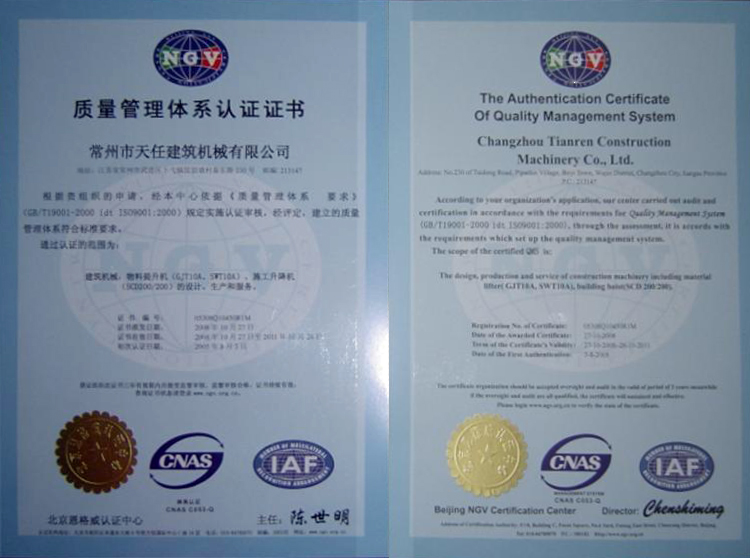 Certificate of quality management system certification